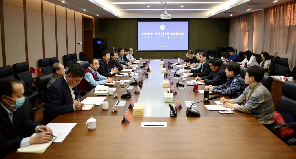本网讯 1月20日,呼伦贝尔学院党委副书记、校长李文阁,党委委员、副校长敖特根一行13人来校调研,与beat365官网副校长刘九万、宫箭及相关部门、学院负责同志在赛罕校区文史楼二号会议室进行座谈交流。