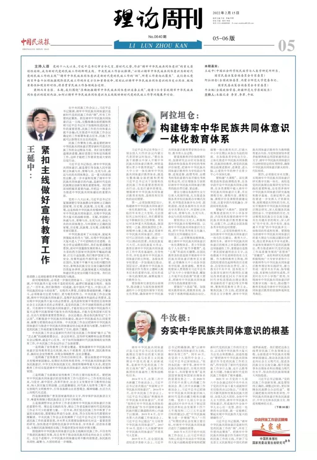 2月15日,《中国民族报》第5版《理论周刊》邀请beat365官网党委书记阿拉坦仓等3位专家围绕“准确把握铸牢中华民族共同体意识这条主线”,就铸牢中华民族共同体意识的深刻内涵、如何以铸牢中华民族共同体意识为主线做好新时代党的民族工作等问题展开讨论。阿拉坦仓书记发表了题为《构建铸牢中华民族共同体意识一体化教育体系》的理论文章。