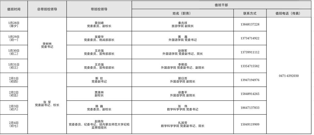 3.值班地点及电话:赛罕校区田家炳教育书院楼801室,值班电话(传真):0471-4392030;