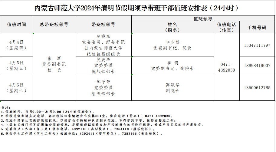 1.值班期间,学校总值班室,设在赛罕校区田家炳教育书院楼801室,值班电话(传真):0471—4392030;