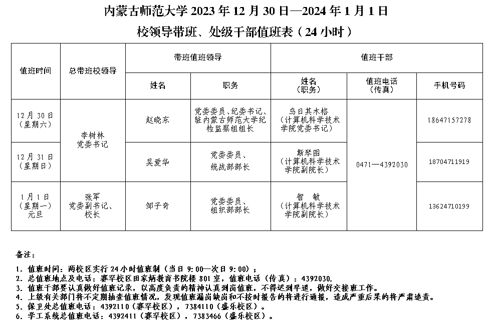 寒期期间,各单位自行安排本单位值班工作,各单位领导需保持通讯畅通。国家法定节假日,则按照学校总值班规定执行,学校总值班室实行24小时值班制度,值班干部要按规定在岗值班,严禁擅离职守。学校总值班室设在赛罕校区田家炳教育书院楼801室,值班电话(传真):4392030。如遇到突发情况或重大事件要第一时间向相关校领导请示报告,迅速、有效处置和化解。