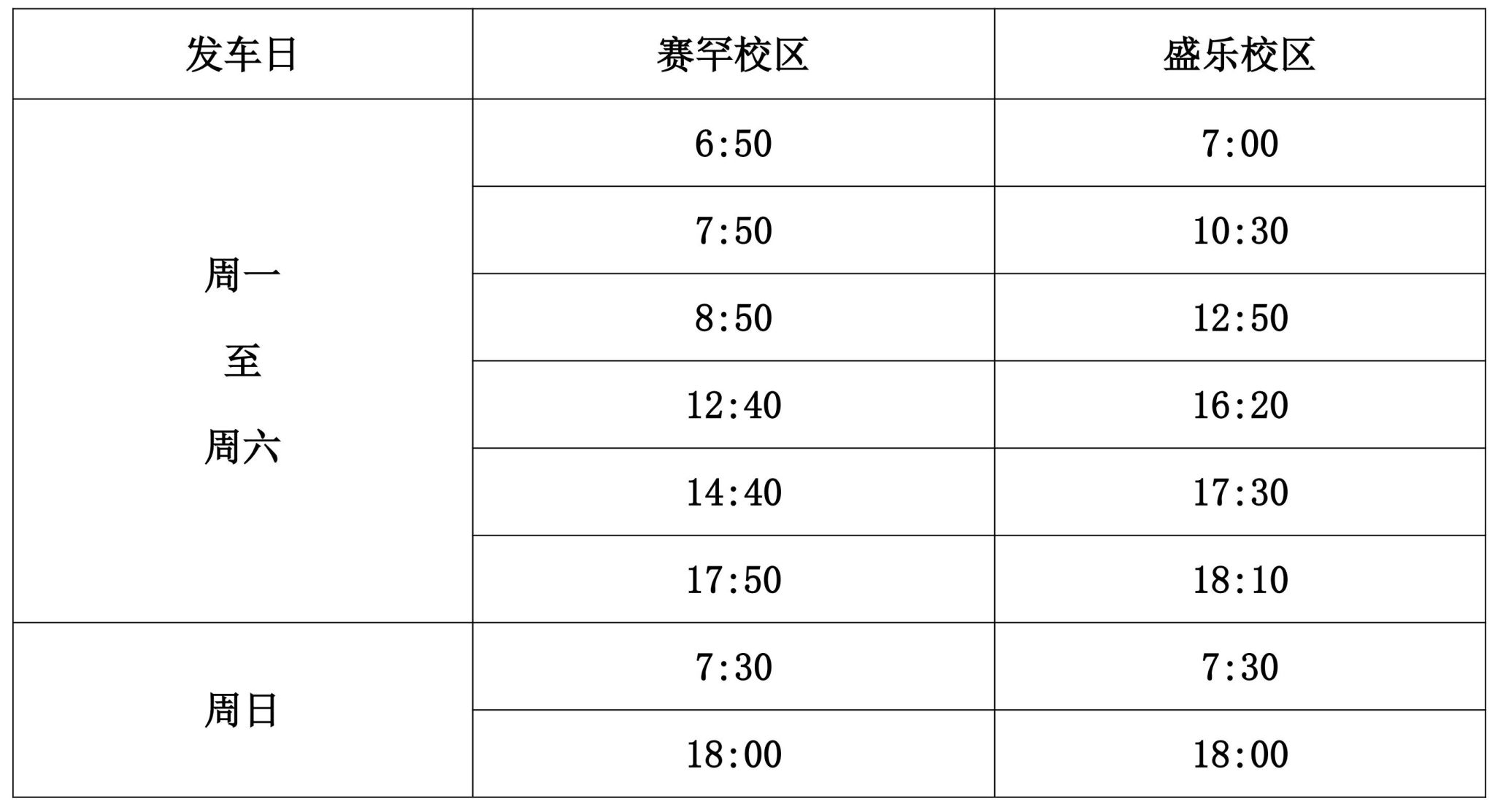 二、10月9日发车时间调整为“表二”,其中取消原赛罕校区“11:20”车次,盛乐校区“16:00”车次,赛罕校区末班车由“18:10”调整为“17:50”,其余时间坐满发车,望周知。