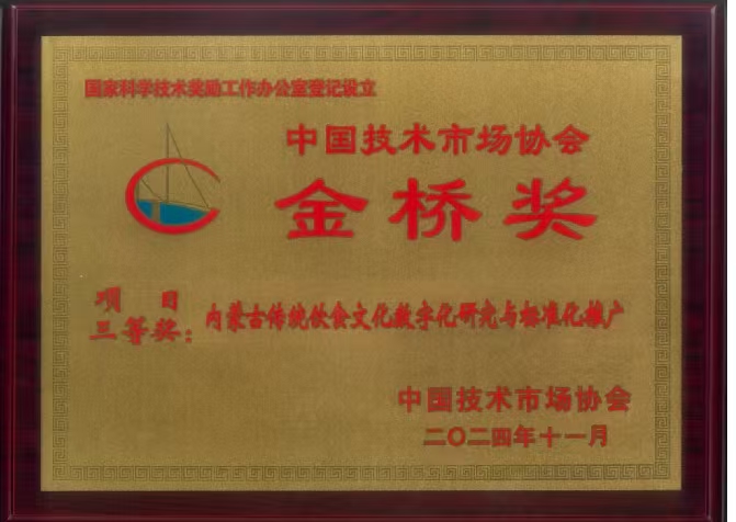 第十二届金桥奖表彰奖励大会于2024年12月12-14日在北京召开。按照《中国技术市场协会金桥奖评奖办法》规定的程序,beat365官网彭文明国家技能大师工作室攻关项目《内蒙古传统饮食文化数字化研究与标准化推广》荣获第十二届中国技术市场协会金桥奖项目三等奖。