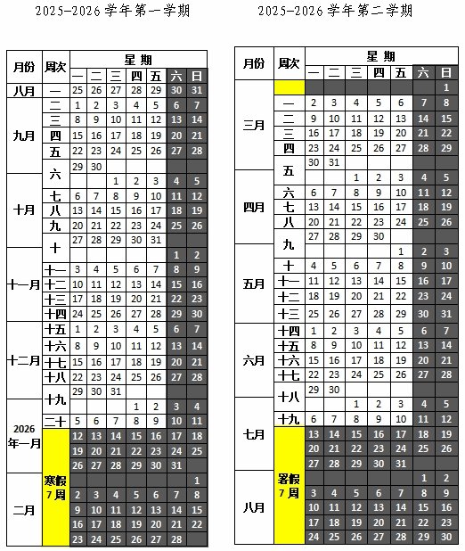 (1)教学20周(含生产劳动等)、期末考试1周,2025年8月25日-2026年1月11日。